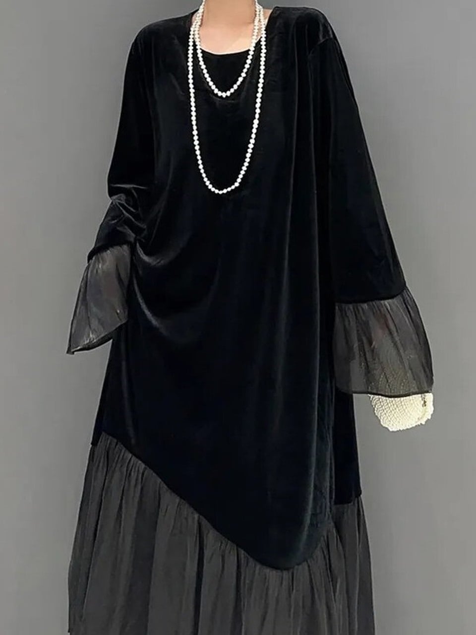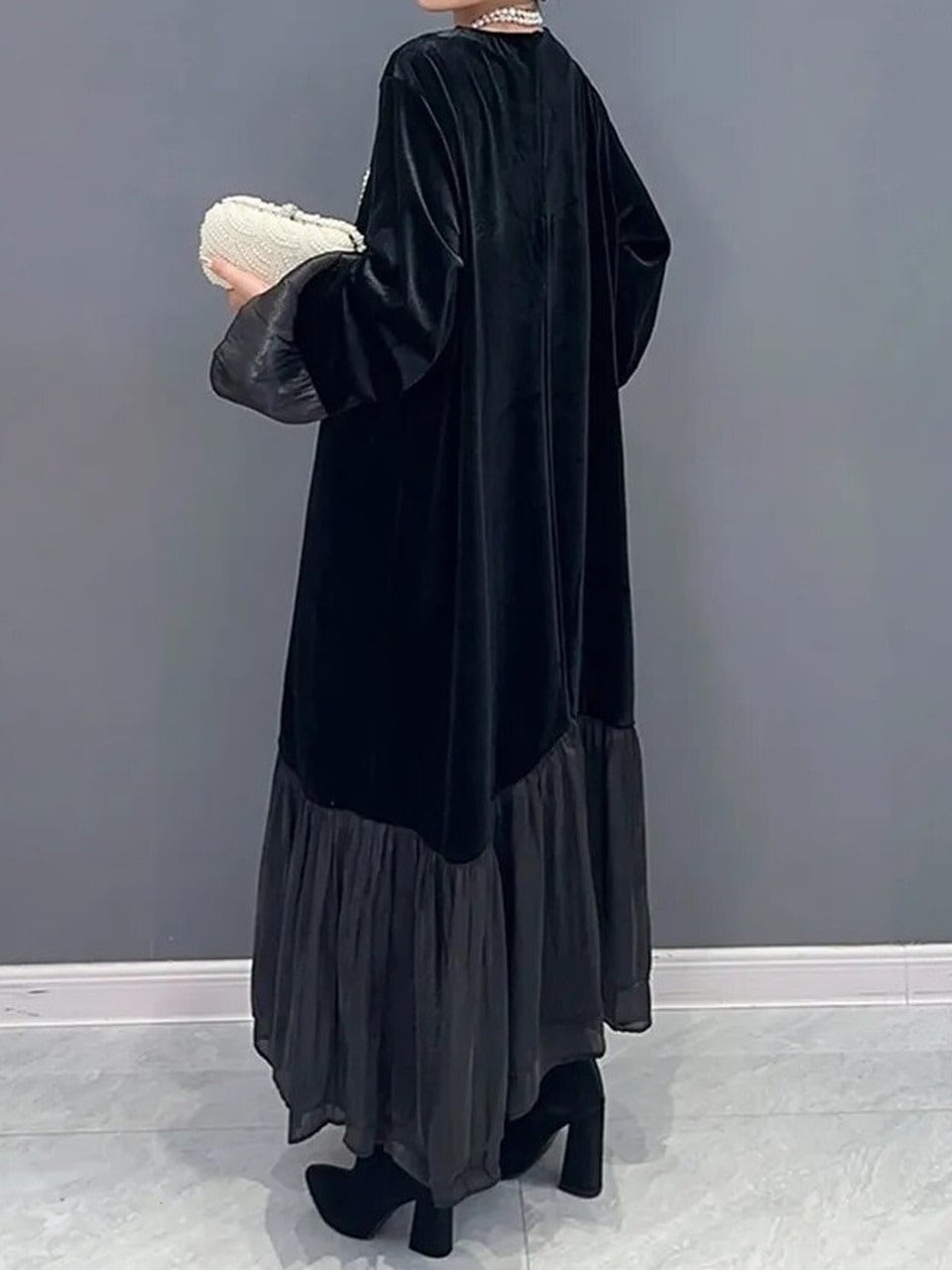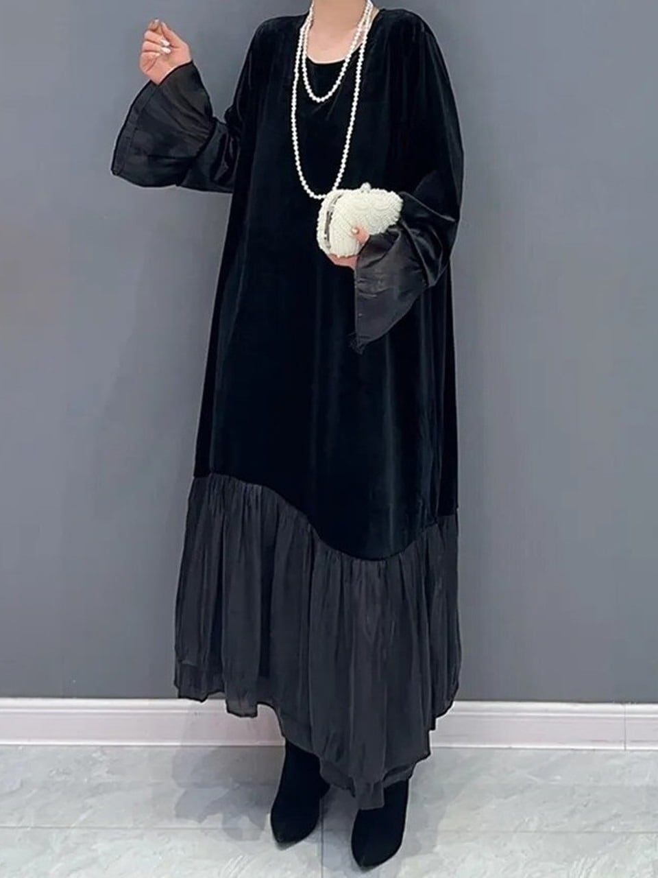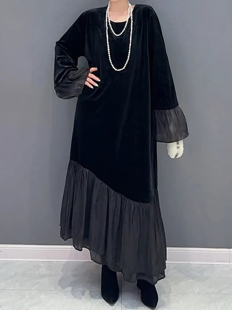 【LK0052】Velvet-combo Black Long Dress
