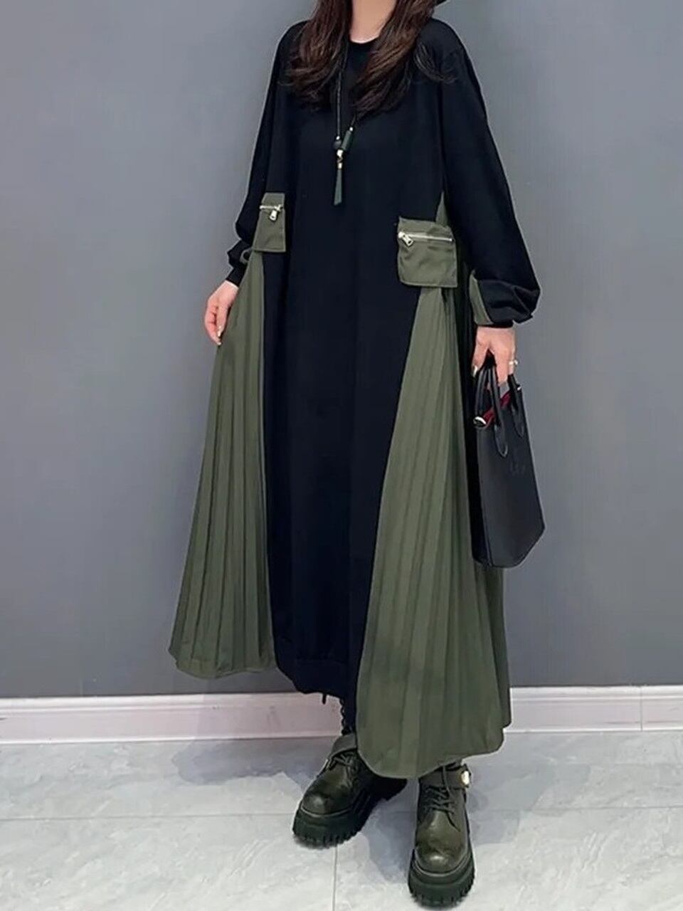 【LK0074】Side Pleats Bicolor Cargo Long Dress