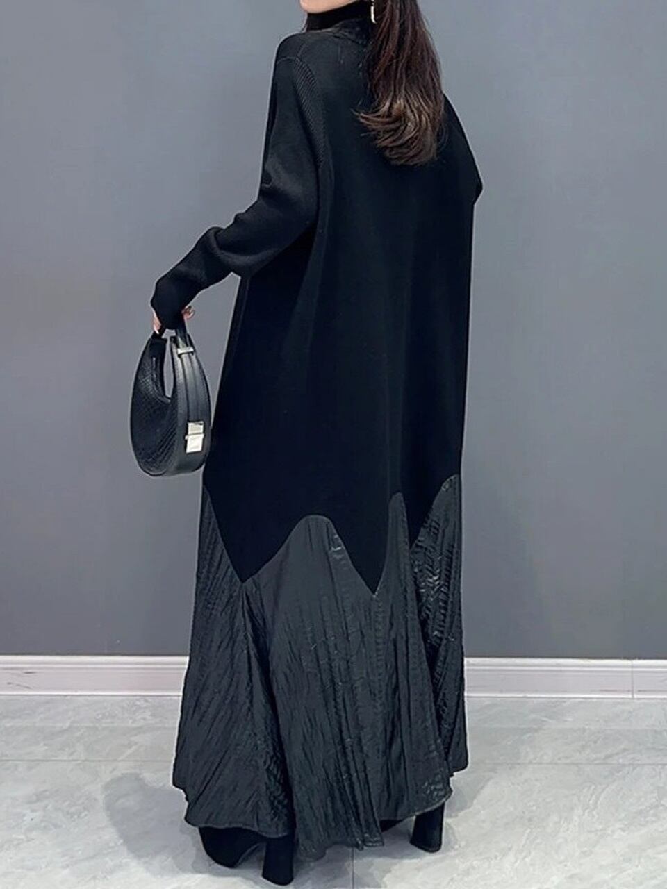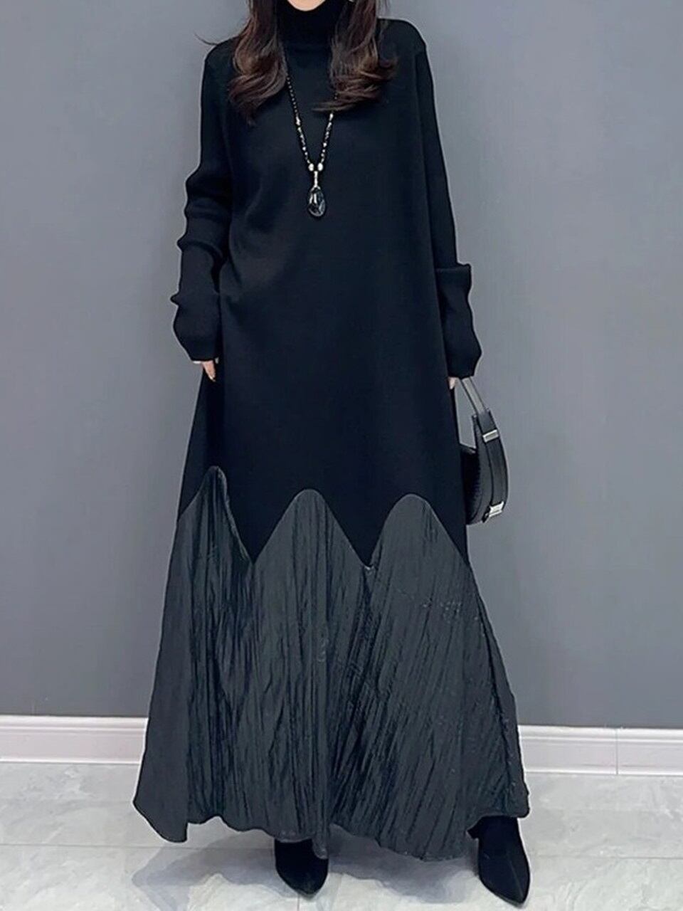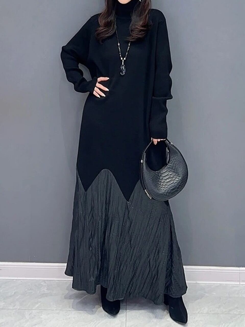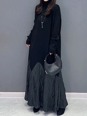 【LK0077】Turtleneck Switching Knit Long Dress