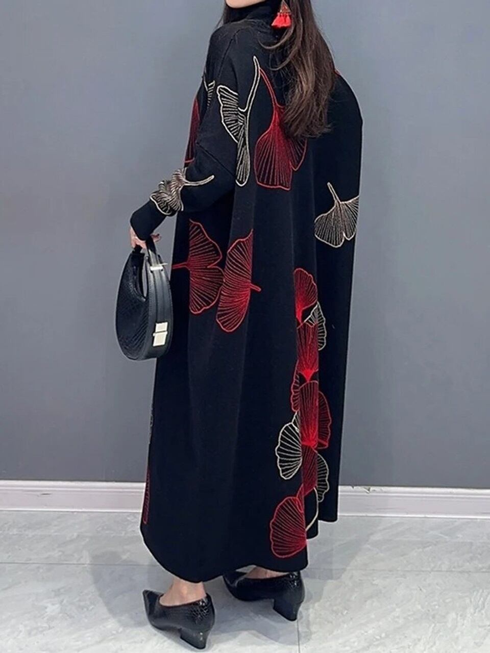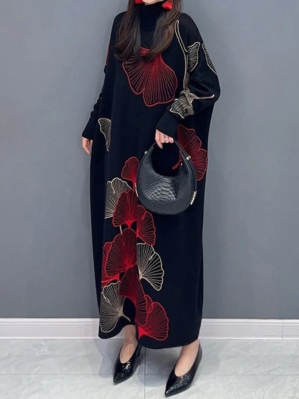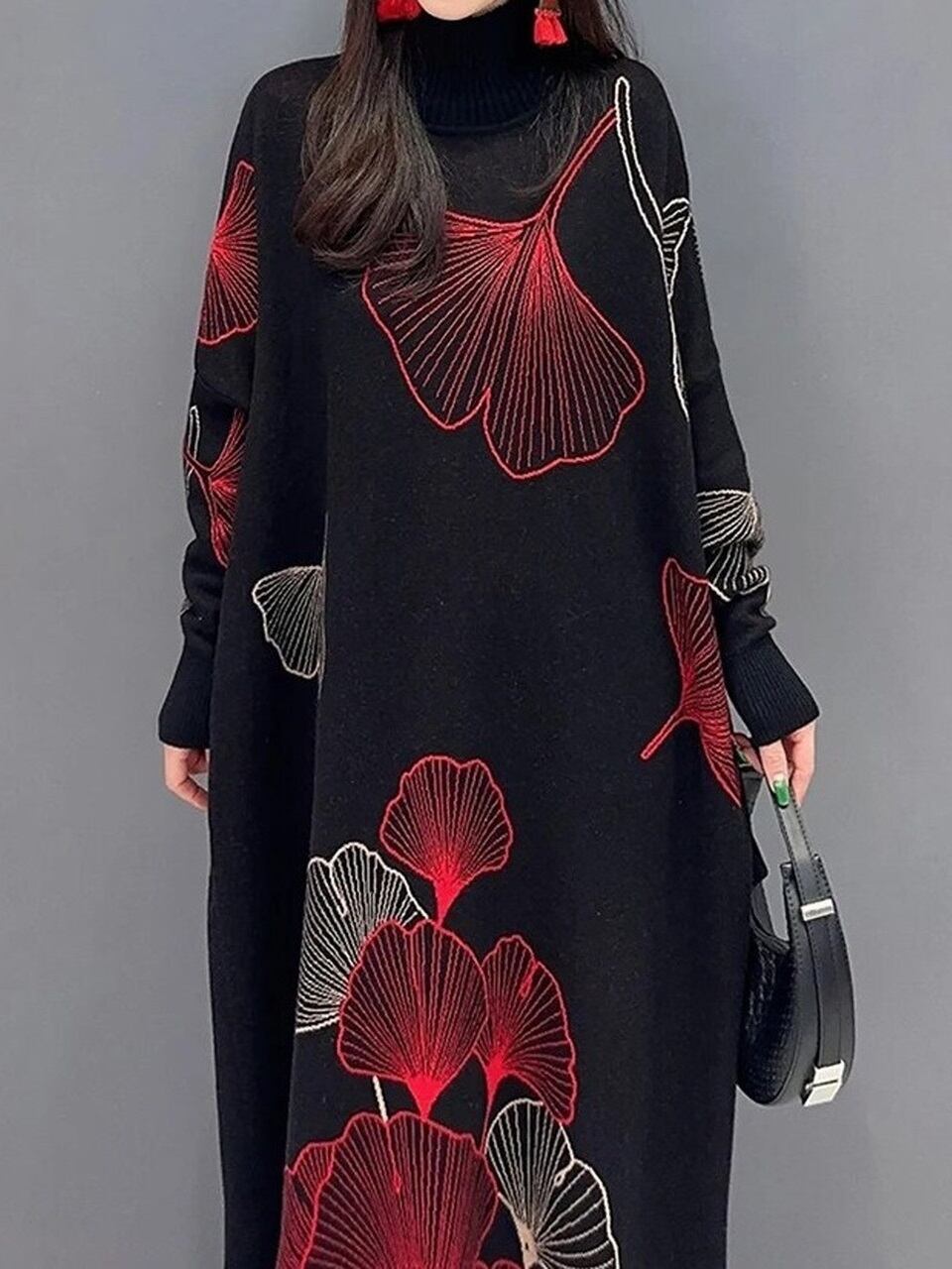 【LK0084】Ginkgo-tree Turtleneck Loose Knit Dress