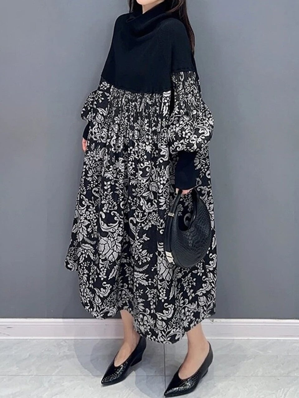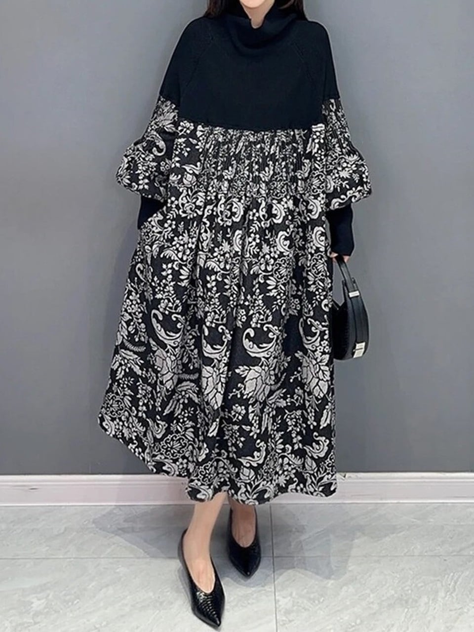 【LK0114】Paisley Switching Long Knit Dress