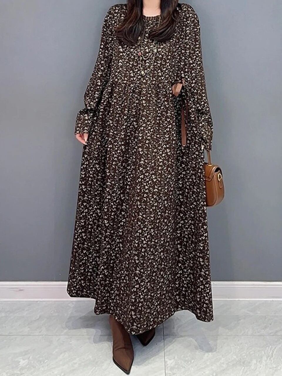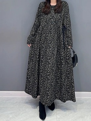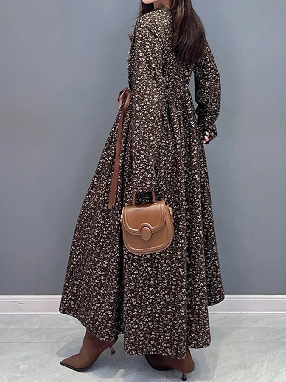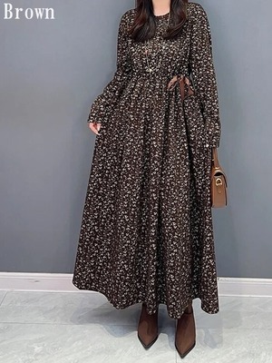 【LK0117】Small-floral Waist-ribbon Flare Maxi Dress